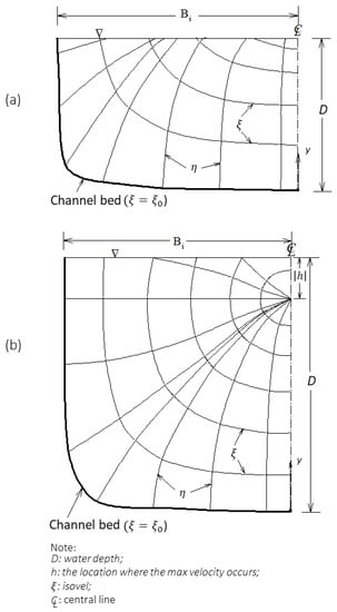 where umax is the max velocity; M is a parameter; is the isovel in Figure 2 [25]; u is the velocity at ; and are the values of at which u = and u = 0, respectively. In addition, a coordinate system can be used to describe the velocity field with a set of isovels, in which and u has a one-to-one relationship, meaning that the velocities are the same on , unlike the Cartesian coordinate system where the same velocity values can occur in difference locations. The on the vertical line is shown in (12):