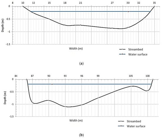 Channel cross sections of the Nankang River at the Guanyin Bridge; (a) left channel; (b) right channel.