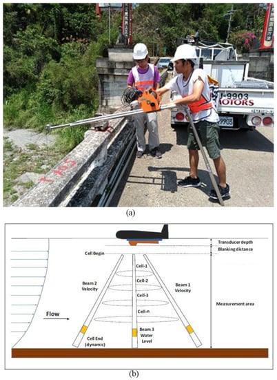 The Nangang Creek at the Guanyin Bridge, where the measurements were taken, is located near the geographical center of Taiwan, with water flowing from east to west. The channel of Nangang Creek near the Guanyin Bridge is divided into left and right channels. As shown in Figure 4, both the two channels are considered rectangular in cross-section, particularly during the periods of high water, while the left channel is narrower in width and shallower in depth. The collision of tectonic plates has uplifted the terrain of Taiwan over time, while floods brought by typhoons always wash the riverbeds, causing riverbeds to become unstable and change shape frequently. An electromagnetic current meter was used to estimate the water discharge at the Guanyin Bridge. The distance between two successive verticals was 3 m. The velocity observations were made based on the water depth of each vertical. When the water depth was greater than 0.6 m, the two-point method was used, while when the water depth was less than 0.6 m, the six-tenths depth method was used. This study also used a vehicle-mounted SVR unit to measure the surface velocity at each vertical (Figure 5a). A total 23 discharge measurements were made in 2018.