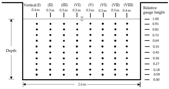 The water in Longen Channel comes from Longen Weir in the middle reach of the Touqian River. Its main function is to divert water from the Touqian River for irrigation and domestic use purposes. The measurement location in Longen Channel was about 1 km downstream from the water intake location. The channel at this location was formed by a box culvert with no place for mounting instruments. Therefore, the top of the box culvert was opened about 1 m wide to allow for discharge measurements. The cross-section of Lungen Channel is rectangular with a width of 2.6 m. Due to the narrow width, the SVR unit can be easily affected by the side walls. With slow water flow, the water surface is very calm, which also makes the SVR unit unable to measure the surface velocity. Therefore, an Argonaut SW acoustic Doppler Flowmeter (Sontek, San Diego, CA, USA) was used to measure the velocity profile, and then a probabilistic velocity distribution equation was used to estimate the surface velocity. The SW Flowmeter was a pulsed Doppler Current profiling system designed for measuring water velocity profiles using three acoustic beams (Figure 5b). The slanted beams, Beams 1 and 2, measure the water velocity in two dimensions, and the down-looking beam measures water depth. An SW Flowmeter is usually mounted in a channel bottom. In this study, the SW Flowmeter was installed under the sounding weight, so that the velocity profile was measured from top to bottom. The velocity observation locations in Longen Channel are shown in Figure 6. The velocity distribution was measured on eight vertical lines, the distance between the verticals was 0.3 m, and the velocity was measured at ten points on each vertical. Table 1 shows the discharge and water depth measurements of eight runs during different water stages having covered the upper and lower water supply capability of Longen Channel. Based on Figure 6, the velocity measurements of Run 4 in Table 1 are shown in Figure 7.