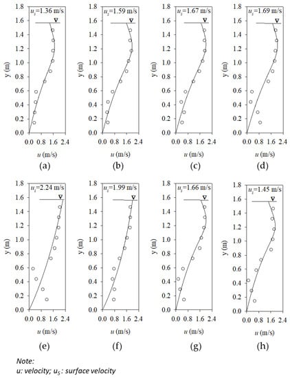Subsectional velocity profile of the Run 4 in the Longen Channel. (a) vertical I; (b) vertical II; (c) vertical III; (d) vertical IV; (e) vertical V; (f) vertical VI; (g) vertical VII; (h) vertical VIII of Figure 6.