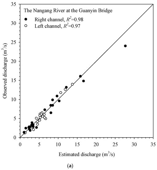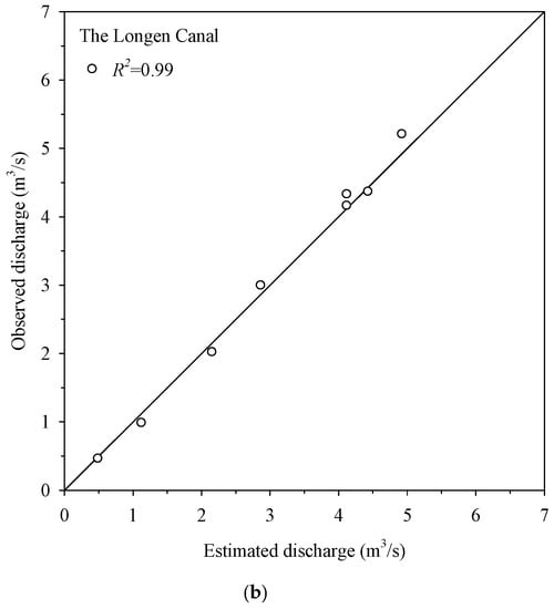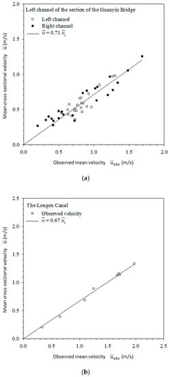 Figure 8 shows the relationship of the mean surface velocity and mean velocity of Nankang River at Guanyin Bridge and at Longen Channel. The surface velocity of the natural river was directly measured by SVR, while surface velocities of artificial channels were estimated by the probabilistic velocity distribution equation. All the points, including those in the left and right channels, distribute closely on the two sides of the regression. The relationships of the mean surface velocity and the mean velocity of the cross section in the left and right channels in Figure 8a do not show much difference.