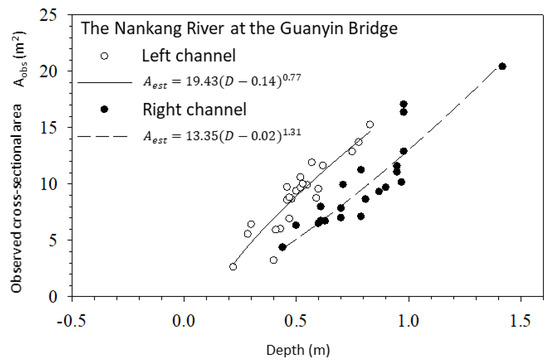 Nangang Creek is a mountain river at Guanyin Bridge, with steep slopes and continuous erosion and sediment deposition. When a flood occurs, the river course will initially be deepened, although the river course will be silted back in as the water recedes. However, the data from 2018 show that the water stage did not change much during the study; nevertheless, the flow and cross-sectional area of the river have changed greatly over time due to erosion and deposition along the river. Thus, it is impossible to estimate the water cross-sectional area based on the water stage. In order to quickly estimate the cross-sectional area, the water depths of the left and right channels at 30 m and 91 m from the initial point were used to establish the relationship between water depth and cross-sectional area (Figure 9). The points (dots and open circles) in the figure represent observed data in the right and left channels, respectively, while the lines represent the depth-cross-sectional area rating curves obtained by nonlinear regression. The nonlinear regression method was applied to relate the water depth and the cross-sectional area with the coefficients given from the observations. The points did not deviate too far from the regression lines. The correlation coefficients of the left and right channels were 0.94 and 0.90, respectively, suggesting that the regression equations are quite useful for making estimations of cross-sectional area by using depths.