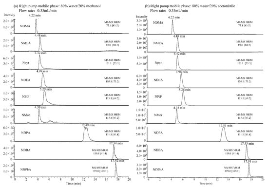 The right pump was primarily used to separate the target from the background matrix. Two mobile phases, water/methanol (80%:20%) and water/acetonitrile (80%:20%), were chosen and compared. In the water/acetonitrile system, the peaks of all nine N-nitrosamines showed great shapes without bifurcation or trailing, and the peak intensity was increased by 25% (Figure 2). Therefore, water/acetonitrile was selected as the mobile phase for the right pump. In this system, the final mobile phases were A: 5 mmol/L ammonium formate in aqueous solution, B: methanol, C: pure water, and D: acetonitrile. Table 2 shows the optimized chromatographic conditions in detail.