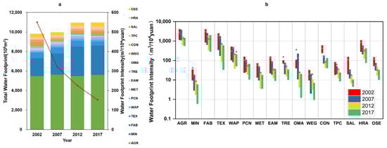 The water footprint and water footprint intensity from 2002–2017. Here, (a) shows the water footprint in 2002, 2007, 2012, and 2017 across all sectors, and (b) is water footprint intensity of each sector from 2002 to 2017.