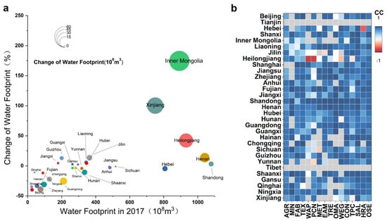 Evolvement on water footprint and changes in water footprint for 16 sectors from 2002 to 2017. In (a), the area of each circle represents the WF change, and (b) shows changes in water footprint for 16 the sectors. The depth of color represents the degree of change in WFI from 2002 to 2017, with Tibet and Tianjin in grey due to missing IO tables or no outputs of the corresponding sector in 2002.