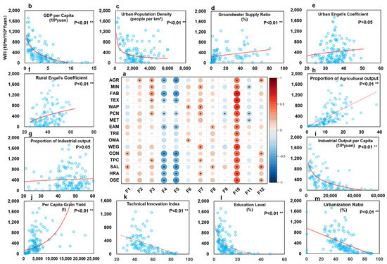 The relation between driving factors, WF, and WFI. Here, (a) represents the relationship between driving factors, while (b–m) reflect the relationship between driving factors and national WFI, on which P values are tagged. The “**” and “*” represent P value is less than 0.01 and 0.05, respectively.