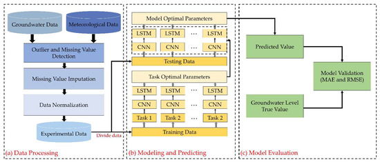 In this study, the groundwater level prediction process is divided into three main stages: data processing, modeling prediction and model evaluation. The specific flow chart is shown in Figure 1.