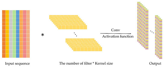 CNN is a type of neural network that includes convolutional computations and is specialized for processing similar gridded data. The concept of convolutional networks was first proposed in 1989 to solve computer vision problems [65]. Due to the weight sharing and local connection characteristics of convolutional neural networks, they have made great contributions in deep learning and have been widely used in various fields [66,67,68]. The main purpose of the convolutional neural network is to extract the feature information of the input, which is mainly done by the convolutional layer. Since the feature information extracted by the convolutional layer is linear, the input data usually has nonlinear characteristics. Therefore, it is necessary to introduce a nonlinear function to solve this problem. This nonlinear function is the activation function in the convolutional neural network. In the specific application of machine learning, the input data is usually not a one-dimensional array. Here, two-dimensional discrete convolution is used as an example to show the convolution operation, and the activation function uses the Relu function as an example. The specific operation is as formula: