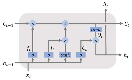 LSTM is a neural network for learning long-term dependencies from time series data. LSTM was first proposed in 1997 [69], and currently has many applications in the field of time series forecasting [70,71,72]. In fact, LSTM is a variant of the recurrent neural network, which solves the problem of gradient disappearance in the traditional RNN training process, and thus can preserve long-term information. The internal structure of LSTM is shown in Figure 5.