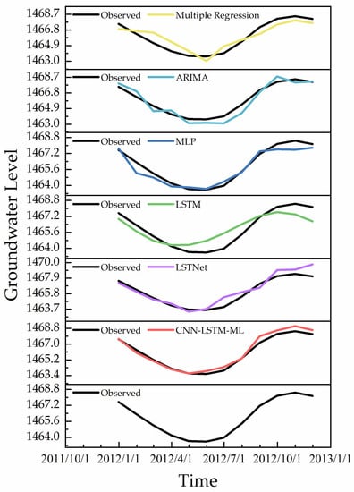 Interestingly, the predictive power of the models for observed wells varies widely. This is reflected in the fact that deep learning models are not necessarily better than traditional time series forecasting models. For example, ARIMA performs even slightly better than LSTM at certain time points, and the prediction performance of LSTM suitable for predicting longer time steps may be inferior to MLP on some observation well data. We believe that this may be related to the size of the training data, which can be proved in experiments with reduced datasets. After reducing the training dataset, all model predictions are affected, but CNN-LSTM-ML is more robust. Among them, the impact on ARIMA is tremendous. This consequence may be due to the fact that in the process of reducing the data set, the trend and related seasonal characteristics in the data are also eliminated, so that ARIMA cannot capture this change well, resulting in a declination in forecasting ability. Furthermore, the predictive performance of the deep learning models LSTM and LSTNet is also greatly reduced if the amount of trainable data is greatly reduced. Under the condition that the amount of training data is reduced by 50%, the traditional multiple linear regression model and MLP work better. This shows that the deep learning model is very dependent on the size of the training set. If the available data are in-sufficient, the performance may be similar to that of the traditional model. This is consistent with the findings of [50,51].