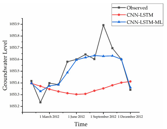 - To verify the performance of the CNN-LSTM-ML, this study is conducted on a real groundwater level dataset in the middle and lower reaches of the Heihe River. Experimental results show that in short-term prediction (1 month), the MAE of CNN-LSTM-ML is 11.7% lower than that of the multiple regression method. In long-term prediction (12 months), the RMSE of CNN-LSTM-ML is 5% lower than that of LSTM. At the same time, the model can still maintain a high prediction accuracy even when the training samples are reduced. All in all, the proposed model can accurately predict groundwater levels, which can help relevant government departments manage water resources and make evidence-based decisions.
