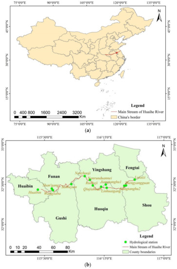 Map of the geographical location of the river studied (the geographical position of the Huai River in China (a), the study area is the main stream of Huaihe River from Huaibin station to Lutaizi station, which flows through four cities and seven counties (b).