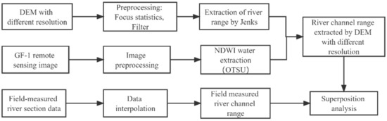 The research route of this study is shown in Figure 2. The statistics that were to be focused on and DEM filtering with different resolutions were preprocessed to adjust the contrast relationship between the grid pixel and its adjacent pixels to enhance the features of the ground objects. Then, the river channel was extracted by the natural discontinuity method to obtain the preliminary results of river channel range. For high-resolution images, NDWI water body was extracted, and OTSU was used to perform threshold segmentation to obtain water body range, which was used to complement the discontinuities of DEM extraction results in order to obtain river channel extraction range based on DEM with varying resolutions. The actual river range can be easily obtained from the measured section data, which can be used to verify the accuracy of the results. Overall accuracy (OA) and Kappa coefficient were used to verify the accuracy of the extraction results.
