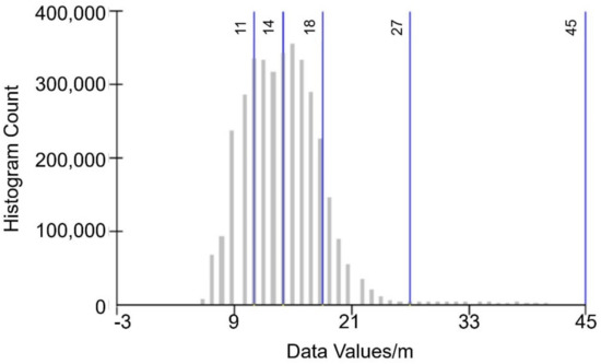 The histogram of DEM terrain has a typical feature of “multi-wave peak,” in which each “wave peak” represents a typical ground object, as shown in Figure 3. The river channel classification of this model adopts “natural discontinuity point” algorithm. The features with different elevations are naturally grouped according to the designated classification number, while the river and channel groups are the ones with the smallest elevation among the natural groups. The number of feature features is designated according to the number of feature features in DEM, which are reflected in different areas in DEM histogram, generally ranging from 3 to 10.