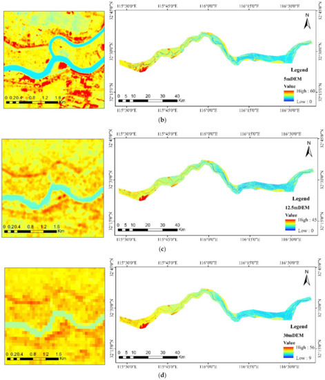 DEM data with resolutions of (a) 2 m, (b) 5 m, (c) 12.5 m, (d) and 30 m, respectively. Resolution is the smallest unit of measurement used to record data and is used to describe the area represented by a pixel point in the image. For example, DEM with 2 m resolution indicates that the area of a pixel in the DEM data is 2 m × 2 m).