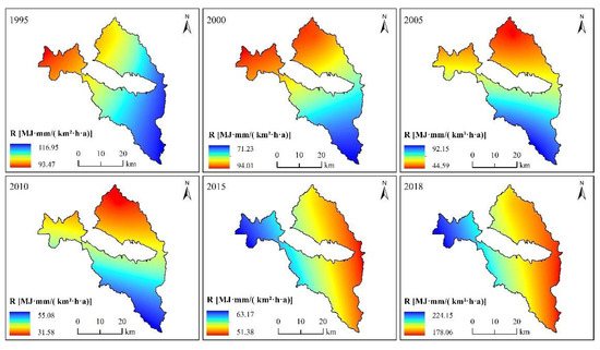 - The average precipitation erosivity factors of the North and South Mountains of Lanzhou in 1995, 2000, 2005, 2010, 2015, and 2018 were 110.06, 83.20, 71.09, 46.68, 56.97, and 198.61 MJ·mm/(km2·h), respectively. Spatially, precipitation erosivity of the North and South Mountains decreased from southeast to northwest in 1995, 2000, 2005, and 2010, and decreased from west to east in 2015 and 2018.