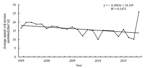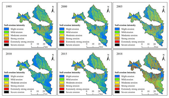 - The average soil erosion modulus of the North and South Mountains of Lanzhou fluctuated and decreased from 1995 to 2018. The intensity of soil erosion in 1995, 2000, 2005, 2010, 2015, and 2018 was mainly slight erosion, distributed primarily in the northwest and southeast of the North and South Mountains. Strong, extremely strong, and severe soil erosion was distributed primarily in the middle of the South Mountain, and a small amount in the middle of the North Mountain.