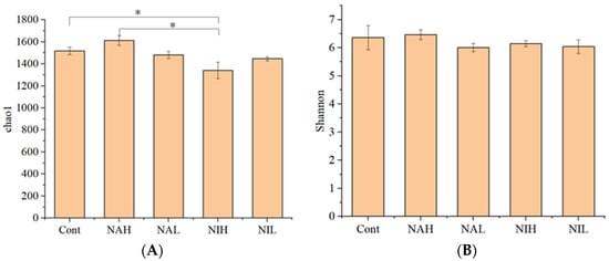 Alpha diversity of biofilms from the different treatments. (A) Richness, indicated by the Chao1 index. (B) Diversity, indicated by the Shannon index. Cont: control; NAH: 1 mg/L sodium selenate; NAL: 100 μg/L sodium selenate; NIH: 1 mg/L sodium selenite; NIL: 100 μg/L sodium selenite. * represents that there is a significant difference between these two groups.