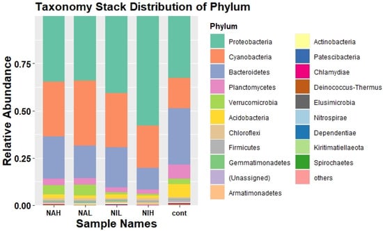 Community composition at the phylum level of the different treatments, selected species with relative abundance greater than 1%. Cont: control; NAH: 1 mg/L sodium selenate); NAL: 100 μg/L sodium selenate; NIH: 1 mg/L sodium selenite; NIL: 100 μg/L sodium selenite.