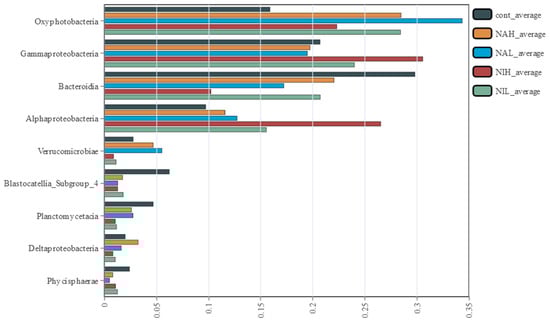 Changes in the relative abundance of the dominant species at class level from different treatments (n = 3). Significant differences between all the treatments were determined by Kruskal–Wallis (KW) sum-rank test and then corrected for multiple test according to the Benjamini–Hochberg false discovery rate (FDR) procedure, with p < 0.05. Cont: control; NAH: 1 mg/L sodium selenate); NAL: 100 μg/L sodium selenate; NIH: 1 mg/L sodium selenite; NIL: 100 μg/L sodium selenite.