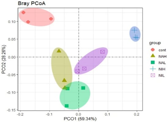 Principle coordinate analysis (PCoA) of community structure based on the Bray–Curtis distance from the different treatments. Cont: control; NAH: 1 mg/L sodium selenate); NAL: 100 μg/L sodium selenate; NIH: 1 mg/L sodium selenite; NIL: 100 μg/L sodium selenite.