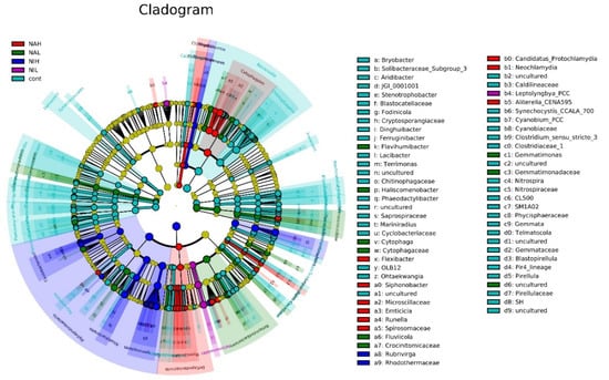 Furthermore, the differences of species abundance between the different groups were detected using LEfSe analysis. The phylogenetic clades of the different species detected are shown in Figure 5.