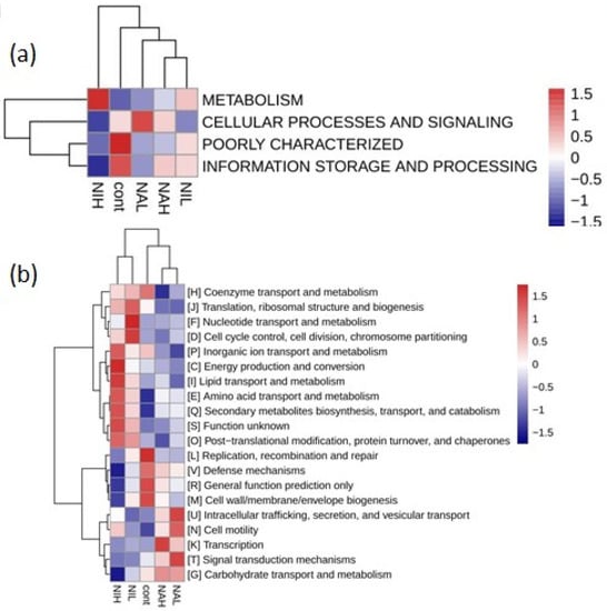 COG abundance clustering heat map at the level 1 (a) and level 2 (b) in the five treatments. Cont: control; NAH: 1 mg/L sodium selenate); NAL: 100 μg/L sodium selenate; NIH: 1 mg/L sodium selenite; NIL: 100 μg/L sodium selenite.