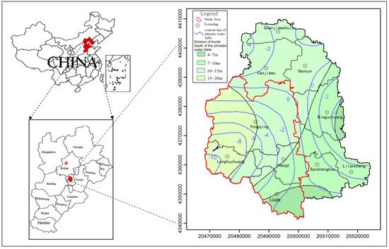 Yongqing County is a county-level city in Langfang (116°22′–116°43′ E and 39°07′–39°28′ N), covering the middle of Hebei Province, the hinterland of the North China Plain, and the middle section of the Beijing-Tianjin Golden Corridor, with a total surface area of 776 km2. The centers of the triangle of Beijing, Tianjin, and Baoding are located in the hinterland of Beijing and the economic circle around the Bohai Sea (Figure 1). The study area is located 60 km north of the capital Beijing, 60 km east of Tianjin City, 80 km from the capital airport, and 100 km from Tianjin Xingang. The study area is mainly located in the western part of Yongqing County and the eastern plain area of the Taihang Mountains, covering four townships, namely Yongqing Township, Longhuzhuang Township, Houyi Township, and Liujie Township, covering a total area of about 374 km2. The northwestern and southeastern parts of the study area are characterized by high and low topography, respectively. In addition, the study is not flat and has some irregularities due to the interactive deposition of rivers, with the presence of several lowlands and depressions distributed at river crossings. The rivers are characterized by low erodibility since they are plain-type. According to the type of geomorphogenesis and surface morphology, the study area is located in a secondary geomorphic unit of alluvial the microtilt plain area.