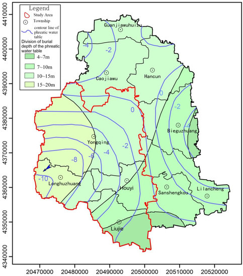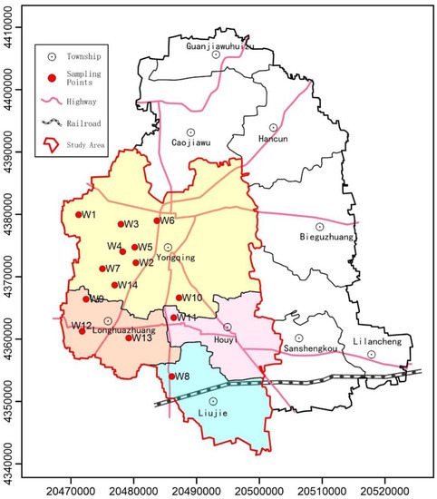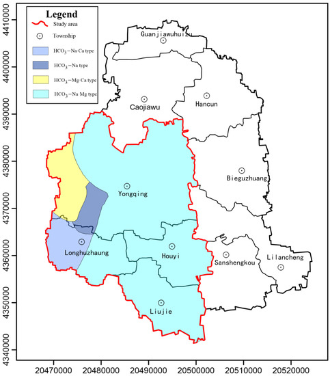 It can be seen from Figure 4 that the HCO3−-Na·Mg facies type of groundwater was observed in a major part of the study area, covering mainly the east-central part of Yongqing Township, Houyi Township, Liujie Township, and the eastern part of Longhuzhuang Township. Whereas HCO3−−Na, HCO3−−Mg·Ca, and HCO3−−Na·Ca facies types were mainly distributed in the southwestern part of the urban area of Yongqing Town, the western part of Yongqing town, and the western part of Longhuzhuang Township, respectively. In addition, the groundwater facies types in the study area are more complex, which suggests influences of human activities on the hydrochemical characteristics of groundwater in the shallow aquifer in the study area [23].