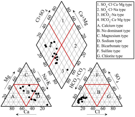 The groundwater facies types in the study area were determined by calculating first the relative content of anion and cation in the collected groundwater, and then drawn the Piper diagram (Figure 3). Actually, the groundwater facies type can be determined by plotting groundwater sample points in all three zones (2 triangles and 1 diamond) of the Piper diagram [18].