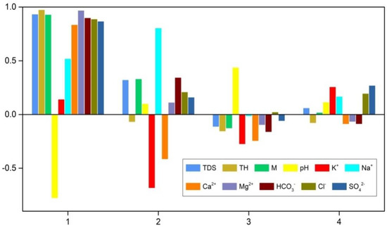 Factor analysis is a statistical method used to effectively reduce the number of variables (dimensionality reduction) to minimize the loss of information in the original dataset, thus achieving a comprehensive analysis of data [27]. This statistical method has been widely used in various fields of research, including hydrogeological research. In this study, the factor analysis test was used to investigate the factors influencing the hydrochemical characteristics of groundwater.