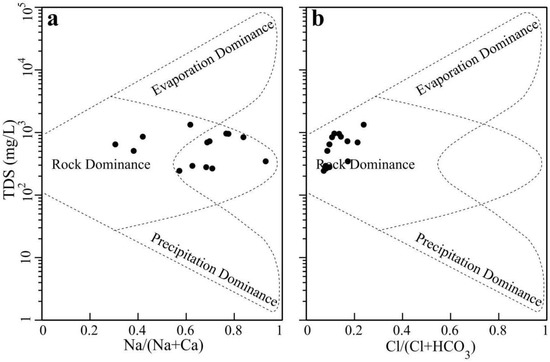 Gibbs diagrams, (a) TDS versus Na/(Na+Ca), (b) TDS versus Cl/(Cl+HCO3).