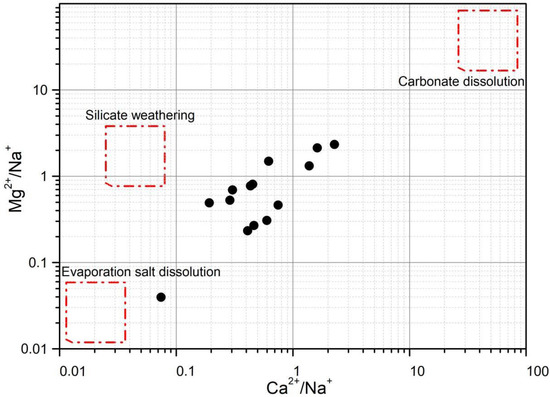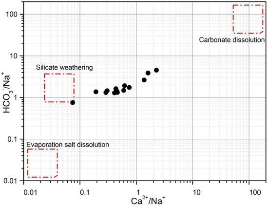 The results showed that most of the water sampling points were plotted between silicate weathering and carbonate dissolution zones, which suggests significant influences of the weathering of silicate and carbonate minerals on the hydrochemical characteristics of groundwater (Figure 7 and Figure 8).