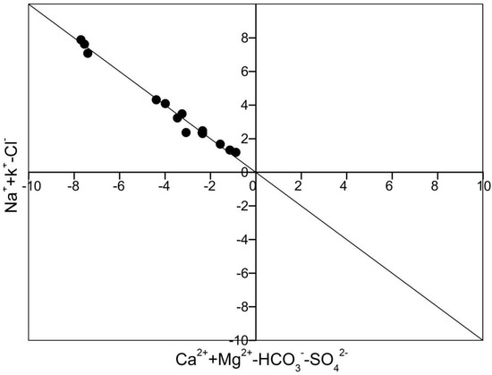 In order to further check whether the ion exchange process occurred in groundwater, the relationship diagram between Ca2++Mg2+-HCO3−-SO42− and Na++K+−Cl− were used for discrimination [30]. Water sampling points in the first quadrant of graphs (positive X and Y-coordinate values) suggest that rock salt dissolution is not the source of Na+ and K+, while the dissolution of peritectic minerals is not the source of Ca2+ and Mg2+ in groundwater, which is explained by the presence of a higher amount of Na++K+ than Cl− and lower amount of Ca2++Mg2+ than HCO3−-SO42− (Figure 9). In addition, equal ions concentrations suggest that a cation exchange process occurred in groundwater.