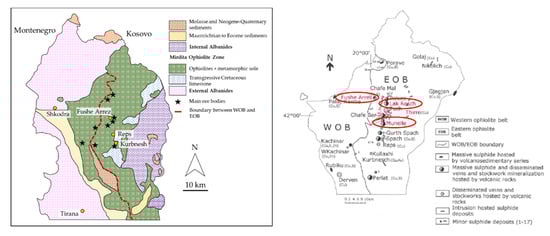 On the left: simplified geological map of the Albanian ophiolites and surrounding units (modified from [29]). The dashed line depicts the approximate boundary between the western- and eastern-type ophiolites. On the right: spatial distribution of major sulfide mineralized bodies in north-central Albanian ophiolites [26], whereas the Fushë Arrëz enrichment plant and the two copper ore mines Munella and Lak Roshi are marked in red circles.