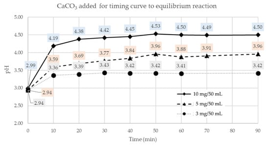 The quantities added in a 50 mL solution were in slots of 3, 5 and 10 mg, depending on the step test. The time required to reach the pH equilibrium in each buffering step was determined by kinetic chemical tests (Section 3.2.1). For each quantity added, the stirrer remained in operation for 30 min for the 3 mg/50 mL quantity and 60 min for the 5 mg/50 mL and 10 mg/50 mL quantities, respectively.