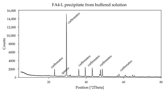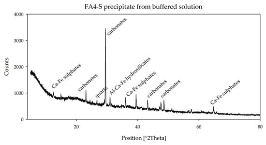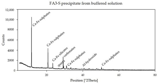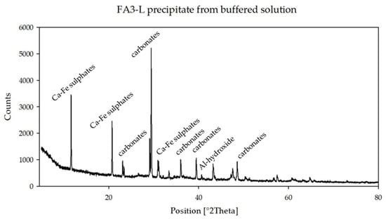 As buffering proceeded to the next step at pH = 6.62, the concentrations of Al, Fe and S decreased, while the concentration of Ca increased. These changes are consistent with the diffraction patterns of the precipitates of the FA3 solution both showing a significant reduction of sulfate phases, whereas carbonate phases stand out and are dominant.