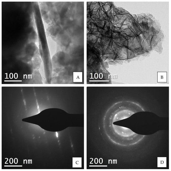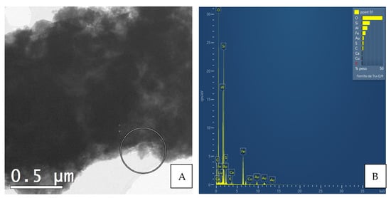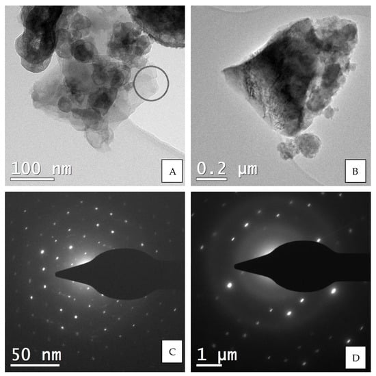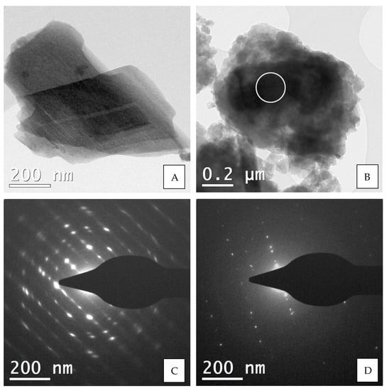 Interpretation of the powder diffraction patterns suggests the possible presence of nanocrystalline or amorphous material. For this purpose and as a preliminary step, a TEM analysis was performed only for the FA3-S leachate precipitate. Together with the aid of EDS instrumentation, the results of the analysis provided valuable information on the size, shape, structure, possible aggregation state of the particles, and chemistry of the observed phases. Thus, images of phases or their aggregates, diffraction patterns (if any), and EDS spectra with the detected chemical species, such as Al, Ca, Fe, Mg, and S (Figure 7, Figure 8, Figure 9 and Figure 10), were collected for each main mineralogical species identified: Ca-Fe-sulfates, Al-Ca-Fe-silicates, carbonates, Al-hydroxides.