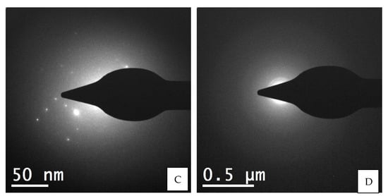 Precipitated phases from FA3-S sample, analyzed by TEM. A nano-crystals aggregate (A) probably an Al-Fe-(hydro)silicate phase, as suggested by EDS analysis (B). The single-crystal pattern (C) shows an evident crystalline structure before the interaction with electron beam of the EDS analysis. After EDS beam there is no pattern (D), because the structure has been dissolved. The black figure in the center of the images (C) and (D), whose size remains unchanged as the magnification changes, is the beam stopper.