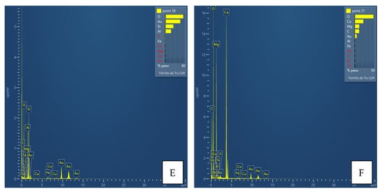 Precipitates of sample FA4-S show the presence of Ca-Fe-sulfates, Al-Ca-Fe-hydrosilicates, carbonates and quartz (Figure 5), while precipitates at higher pH (sample FA4-L) (Figure 6), are mainly composed of carbonates.