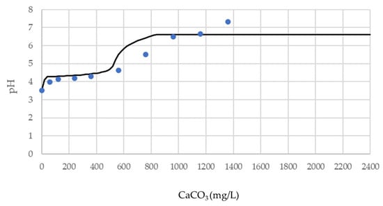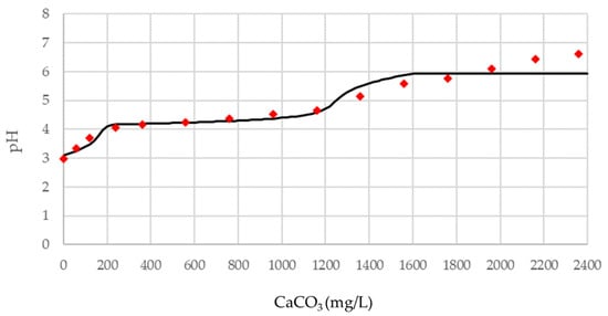In Figure 11, referring to sample FA3, the theoretical curve shows the trend of pH change as a function of the buffering material added as predicted by the model. The acidity of the solution shows nearly stable values for buffer concentration between 200 mg/L and 1200 mg/L and after 1600 mg/L. In these ranges, the lack of pH change implies the formation of precipitates [35,36].