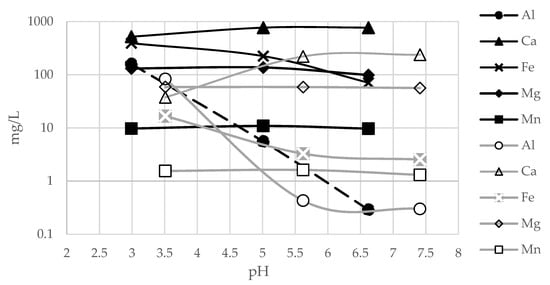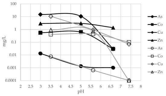 By comparing Figure 11, Figure 12, Figure 13 and Figure 14, we can observe a correlation between the changes in the concentration of elements in solution during the buffering steps and specific pH values. In particular, some elements, such as Al, As, Cu and Fe, undergo appreciable concentration decreases along the flat pH stretch at pH = 4–4.5. These results are consistent with the data in the literature [3,12,37,38,39,40,41,42,43], showing that there is a correlation between chemical species in solution (and their oxidation state) and their precipitation in specific compounds as a pH function.