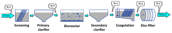 The main purpose of the screening process is to separate solid particles such as organic and inorganic materials from the wastewater and allow the remaining solids particle to sink to the bottom of the primary clarifier. In general, the design for this process is rectangular and has a hydraulic retention time of ~2 h. It is expected that the removal rate of the total suspended solids will reach 50–70% [39]. In addition, by skimming and sedimentation processes, microplastics are also expected to be removed from wastewater [22]. The flow of wastewater also affects the effectiveness of the primary clarifier. If the flow is too fast, it will be difficult for the solid particles to sink to the bottom of the system and vice versa [40].