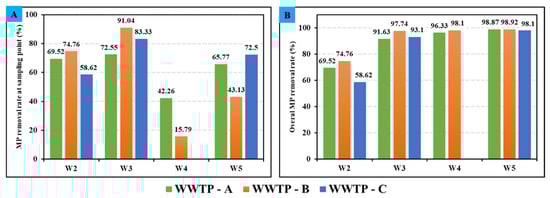 Removal of microplastic in different treatment processes. (A) Percentage of microplastics removed at samping point; (B) Overall percentage of microplastic removal.