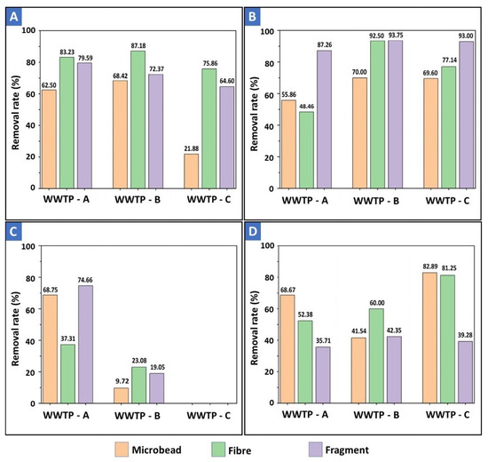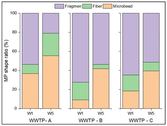 Bioreactor treatment aims to destroy the organic material contained in the wastewater; the resulting suspended particles were deposited in the secondary clarifier. The activated sludge used in this process can indirectly reduce the number of microplastics in wastewater. The number of microplastics further declined during biological treatment and secondary sedimentation. Microplastic removal reached 72.55–91.04% after bioreactor treatment (Figure 2A,B). According to the shape distribution shown in Figure 5B, the fragment was the most dominant fraction removed in samples from all WWTPs, contributing to about 87.26–93.75%. Sheets were also a dominant fraction, ranging from 55.86 to 70.00% in WWTP-B and WWTP-C.