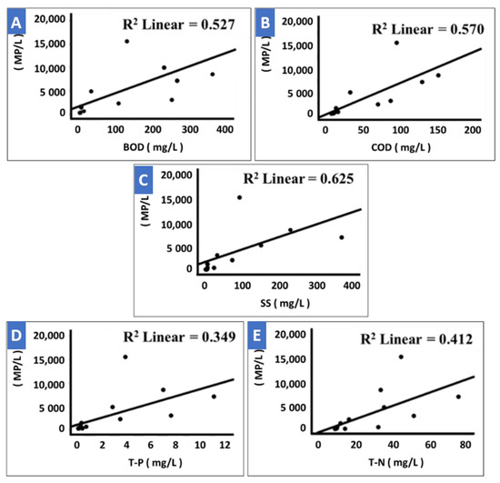Correlation of microplastic concentrations with five wastewater quality parameters. 3.4. Microplastic pollutant load. (A) Microplastic concentration relationship with biological organic demand (BOD); (B) Microplastic concentration relationship with chemical oxygen demand (COD); (C) Microplastic concentration relationship with suspended solids (SS); (D) Microplastic concentration relationship with total phosphorus (T-P); (E) Microplastic concentration relationship with total nitrogen (T-N).