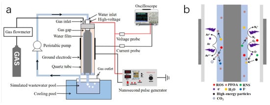 (a) Schematic diagram of the SF-DBD system used in PFOA-polluted water treatment. (b) The reactor diagram used in PFOA simulated wastewater treatment.