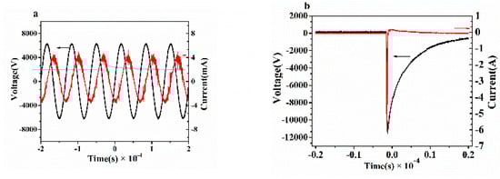 Three power sources were used to treat PFOA-contaminated wastewater. Their waveforms were detected using a digital oscilloscope (DPO 4104, Tektronix Inc, Beaverton, OR, USA)., USA). For the sinusoidal AC power supply (CTP-2000K, Nanjing Suman Electronic Co., Ltd., Nanjing, China) the input voltage was in the range of 0~30 kV with a frequency in the range of 8~40 kHz; for the negative pulse power supply (SY6515, Chengdu Senyuan Technology Co., Ltd., Chengdu, China), the voltage was in the range of 0~16 kV with a frequency in the range of 0~15 kHz, pulse width of 0.5~0.8 μs, and the pulse rising edge period in the range of 104~112 ns. The typical I and V waveforms of three power supplies are presented in Figure 2a,b respectively.
