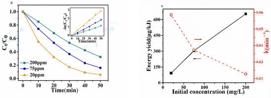 Figure 3 shows that the PFOA concentration can affect the degradation efficiency and rate. The degradation efficiencies of PFOA are 94.3%, 84%, and 67.7%, after 60 min of Ar-plasma treatment, when the concentrations are 20 mg/L, 75 mg/L, and 200 mg/L, respectively. The degradation follows a first-order reaction kinetics as shown in Figure 3a inset. When the concentration increased 10-fold from 20 mg/L to 200 mg/L, the energy yield only increased 7.2-fold from 91.1 μg/kJ to 654 μg/kJ (Figure 3b). Similar results were reported before and were explained by the efficient average power consumption [32], and the concentration of the active species in plasma remained the same at a fixed average power. Therefore, the higher the PFOA concentration, the longer the discharge time, which in turn leads to a lower degradation efficiency [33]. This was evidenced by the decrease in the kinetic constant from 0.0584 to 0.0228 min−1 when the concentration increased from 20 mg/L to 200 mg/L (Figure 3b).
